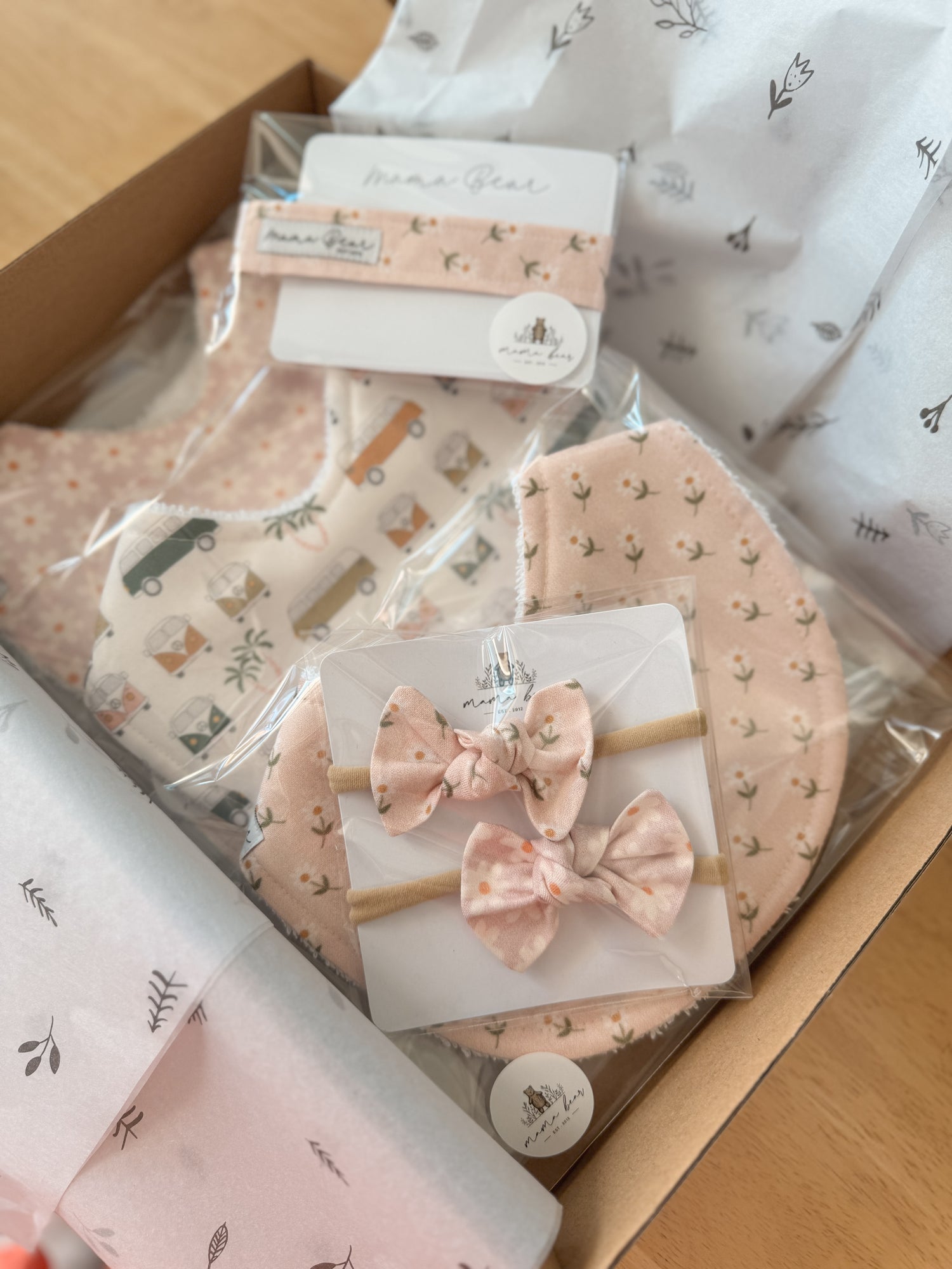 Our Handmade baby girl gift box, featuring three beautifully crafted bibs, two matching hair bows and a dummy clip. The perfect baby shower gift or practical newborn gift idea.