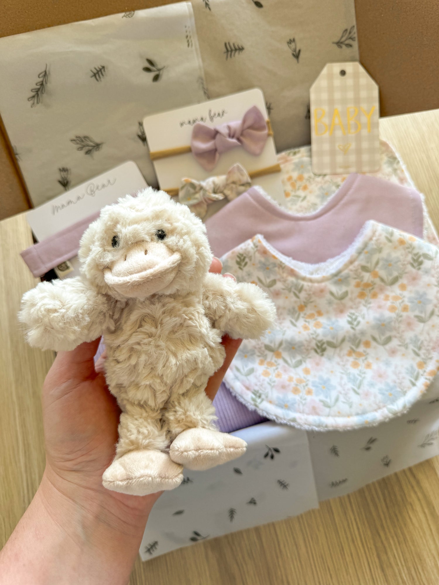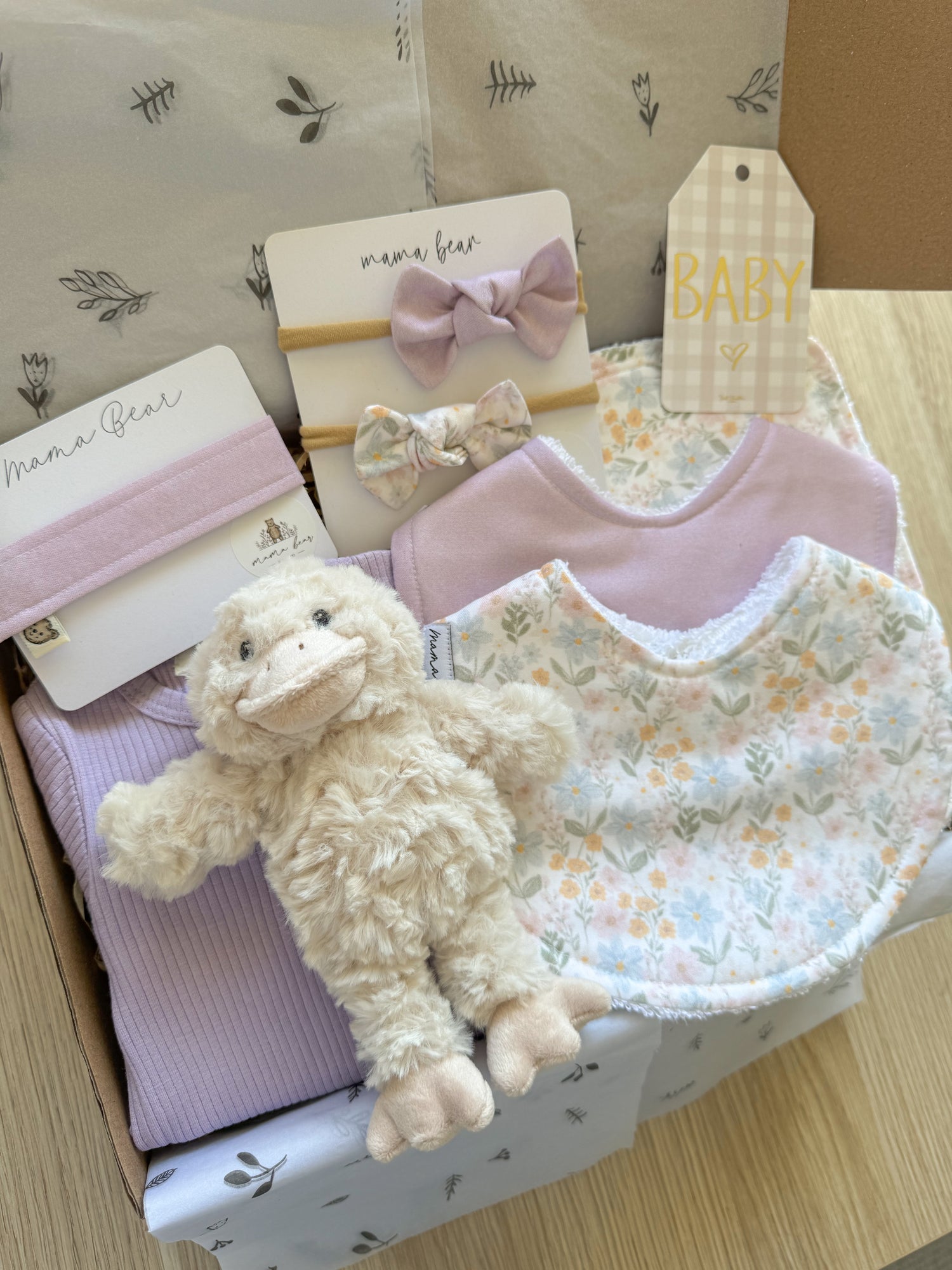 Lilac and floral hues are my favourite! Perfect for a baby shower or unique newborn gift, this giftbox is a refreshing take on the traditional pink palette. Plus you have the option to personalise the dummy clip with baby's name.