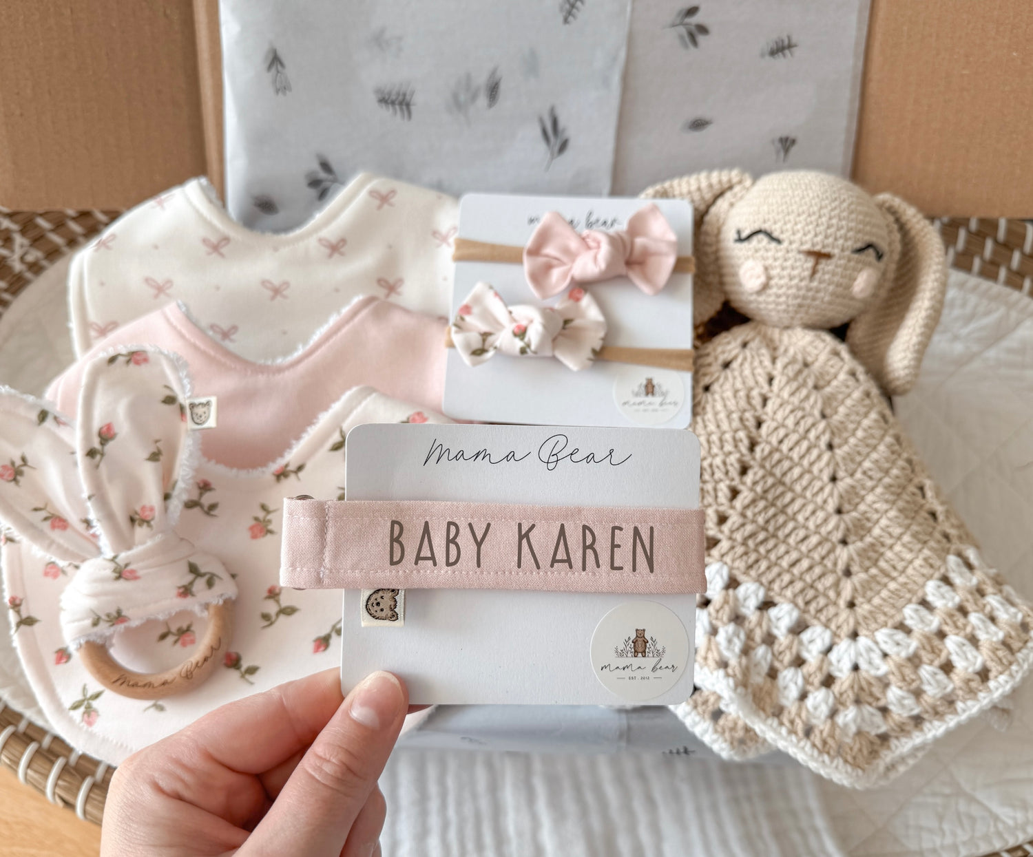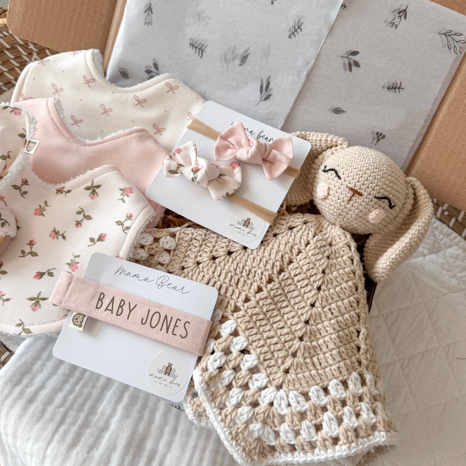 A luxury gift hamper for a baby girl, perfect for newborns, baby showers or a thoughtful keepsake. Featuring our handmade bibs, hair bows, personalised dummy clip & the most gorgeous little bunny friend.
