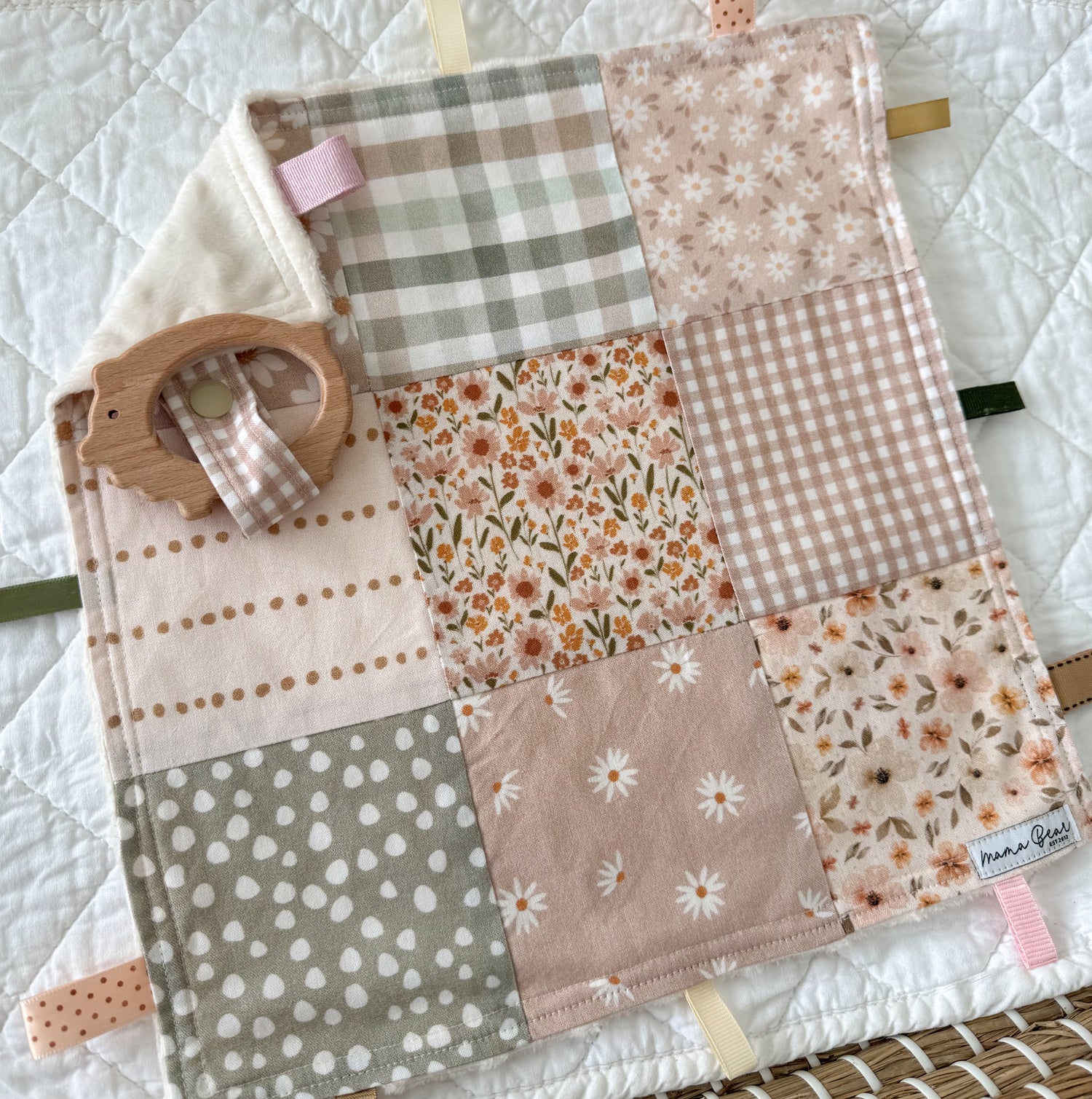 Baby Girl Gift Sensory Taggie Blankie | Muted Floral & Wooden Pig Teether