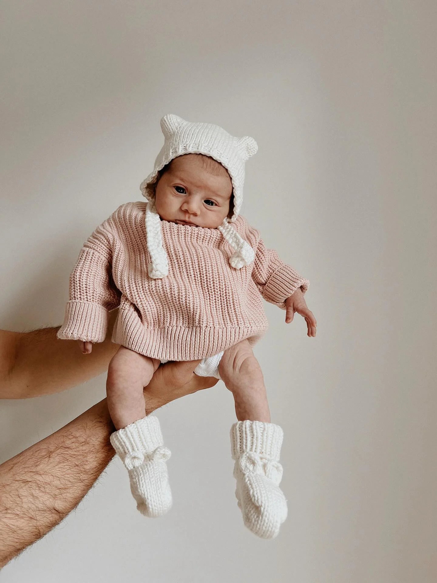 Pop Ya Tot's gorgeous bonnet is crafted from 100% organic cotton, this hand-knitted bear ear bonnet will keep your little one's head warm in style.