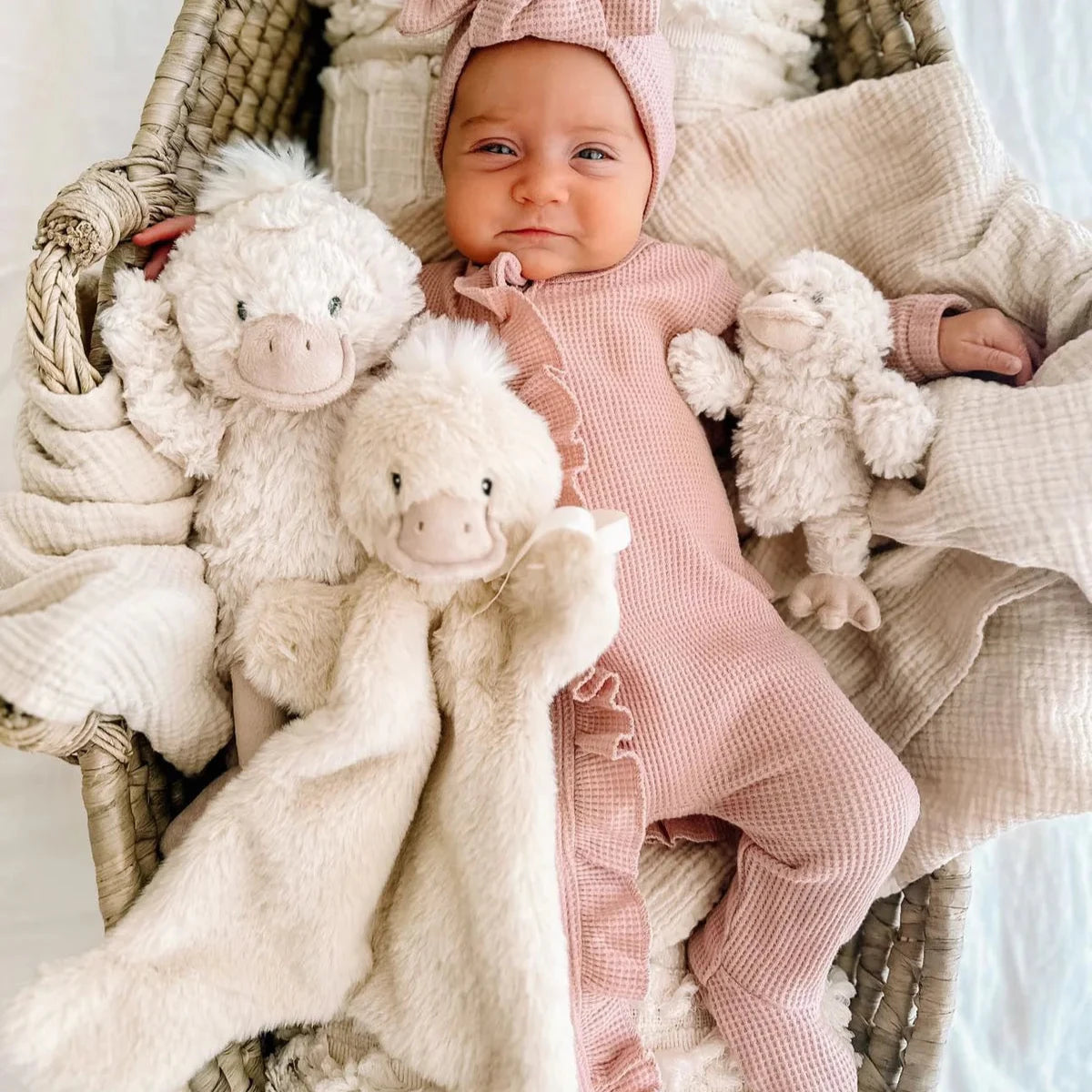 The most snuggliest little duck, perfect for little hands to hold. Designed with a hand puppet pocket and dummy holder. This gorgeous duck makes for a lovely baby shower or newborn gift.