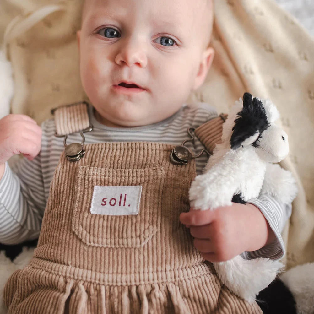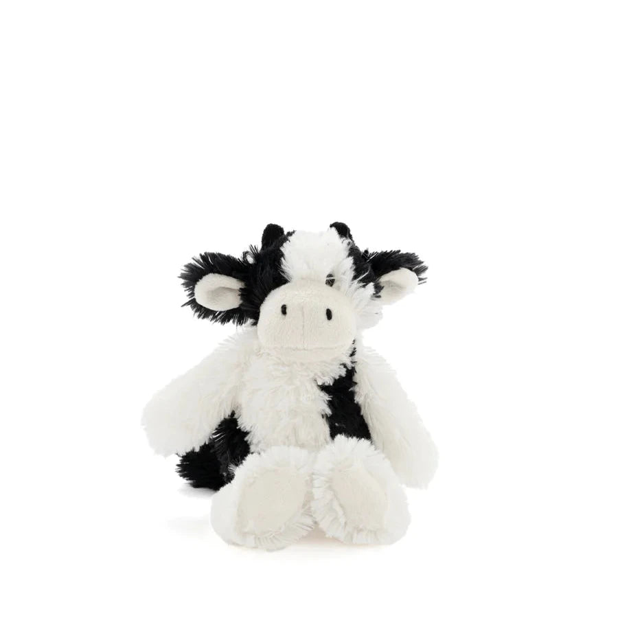 A soft and lightweight black and white dairy cow, perfect for newborns and farm animal theme gifts, easy for little hands to hold.
