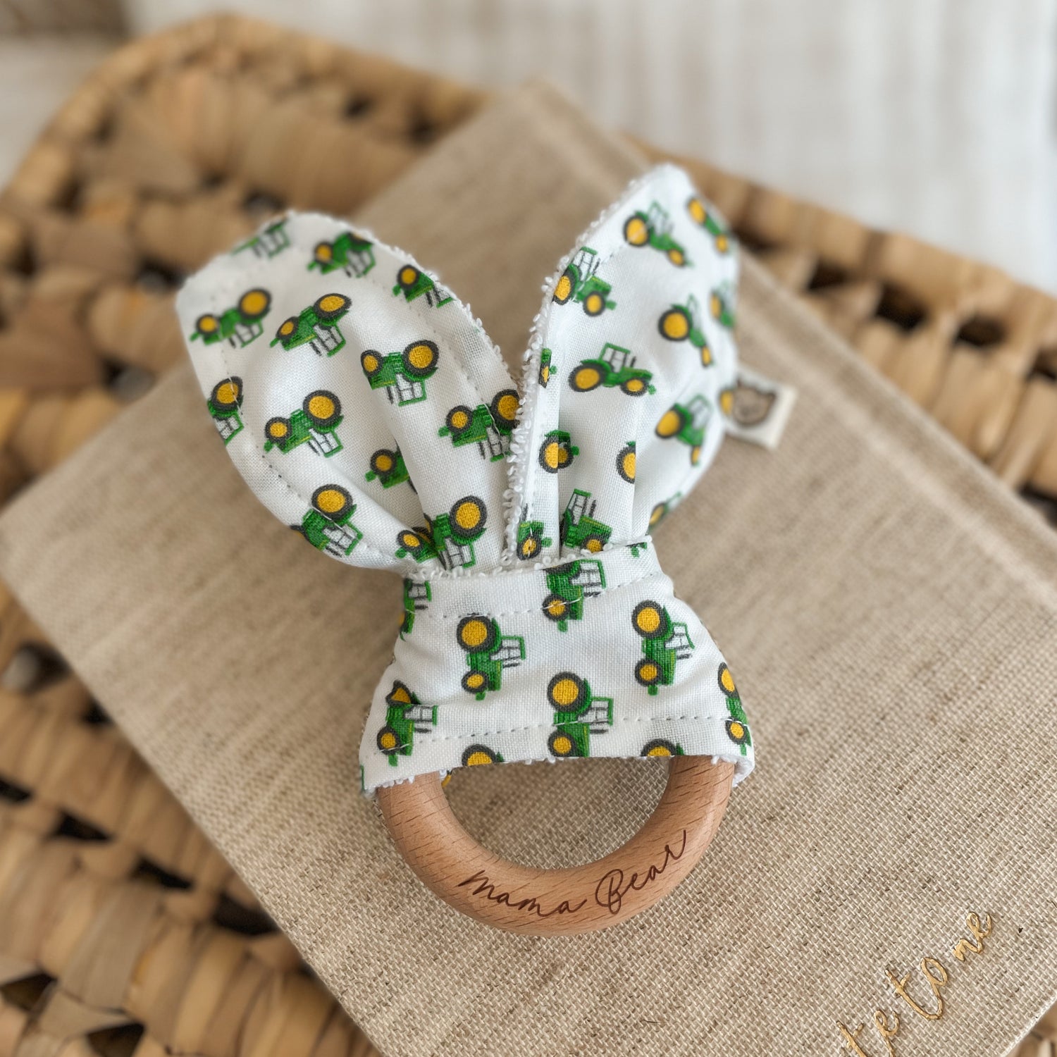 Natural wood & Bunny Ear Teething Ring - Green Tractors