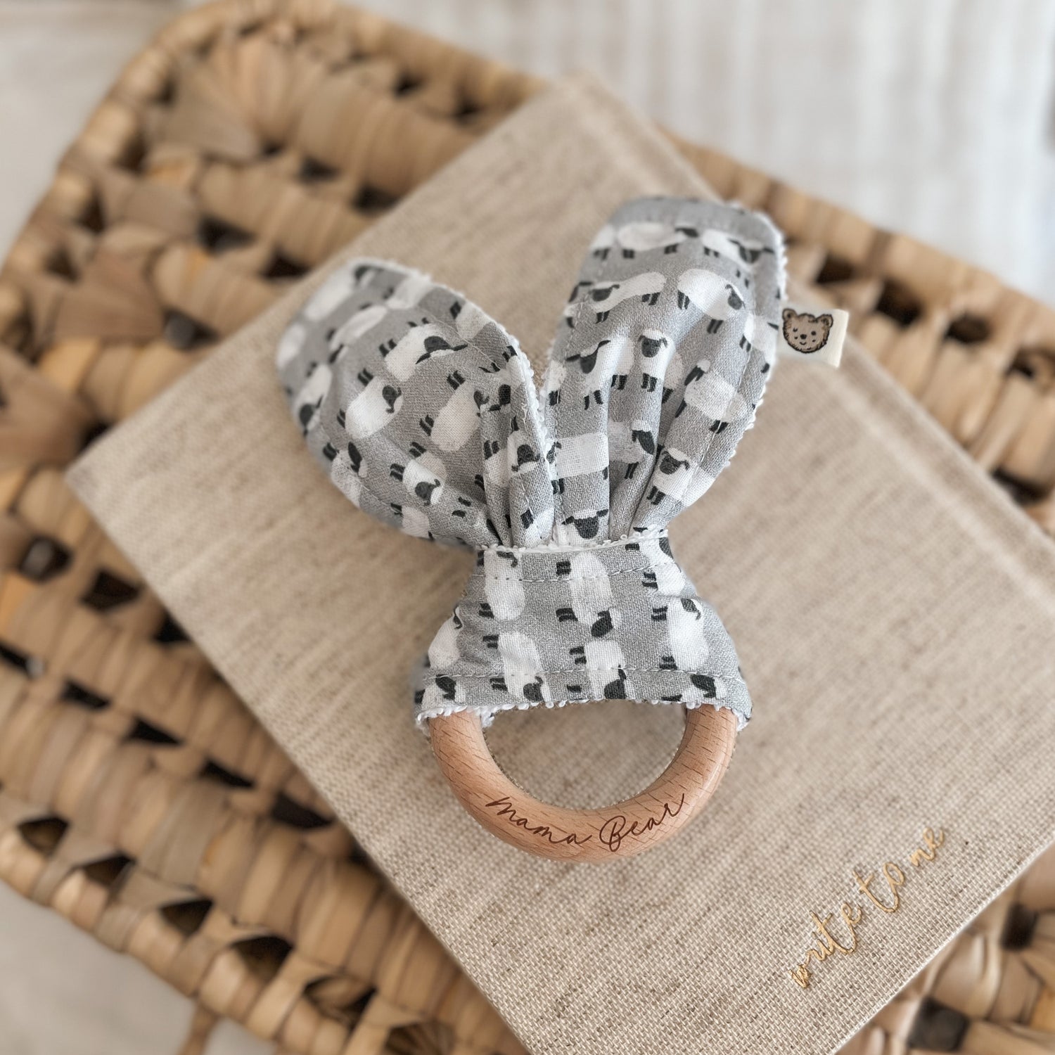 Natural wood & Bunny Ear Teething Ring - Grey Sheep