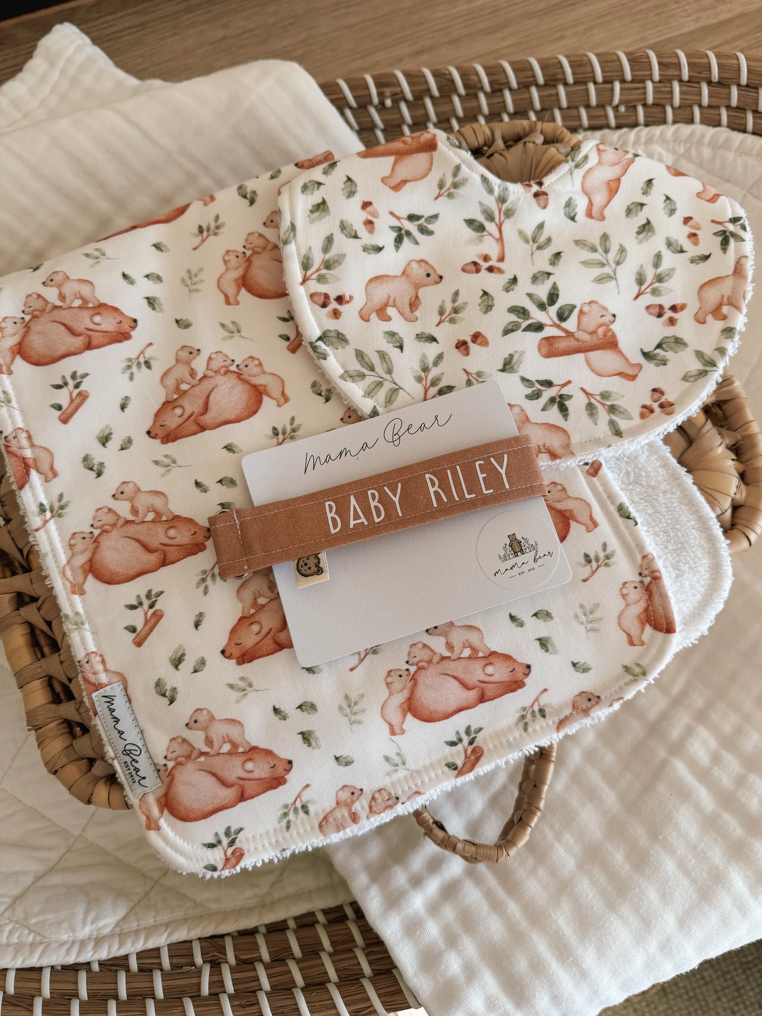 1 x Handmade Burp Cloth in Mama & Baby Bears - The contoured shape fits nicely up against the neck, and is generously sized for great coverage - keeping everyone dry!
