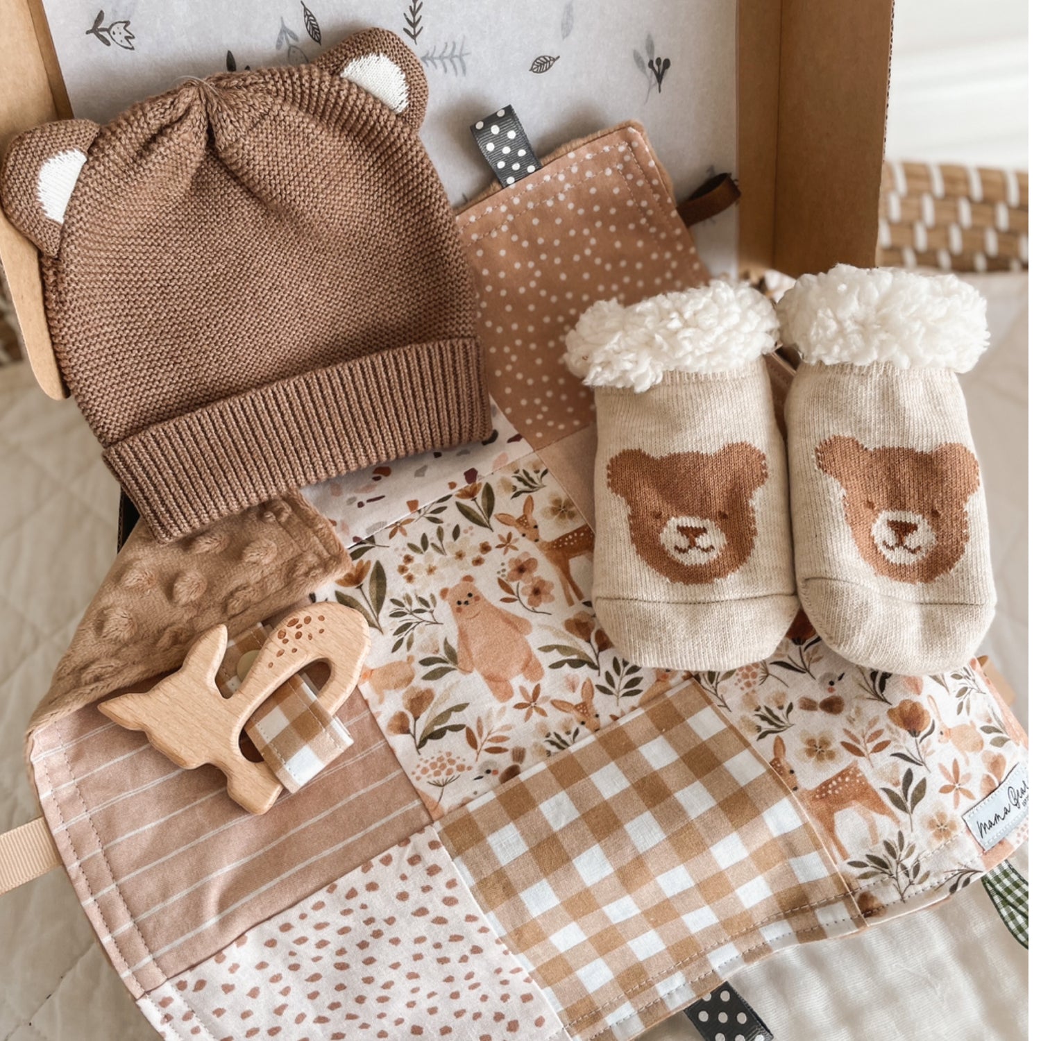 1 x Mama Bear Taggie Blankie - backed with the softest minkee dot fabric, making it super snuggly, and are a fun, portable way for babies to explore textures with their little fingers. Great for Sensory Development - hand/eye co-ordination & the best part... they don’t make a sound! Measuring approximately 25cm square, has an untreated wooden teething ring attached, and a fabric tab, will clip onto a pram for safekeeping, & safe for little mouths. Twelve (12) x looped ribbon attachments, which have been triple stitched - making it ‘BEARY’ Safe.